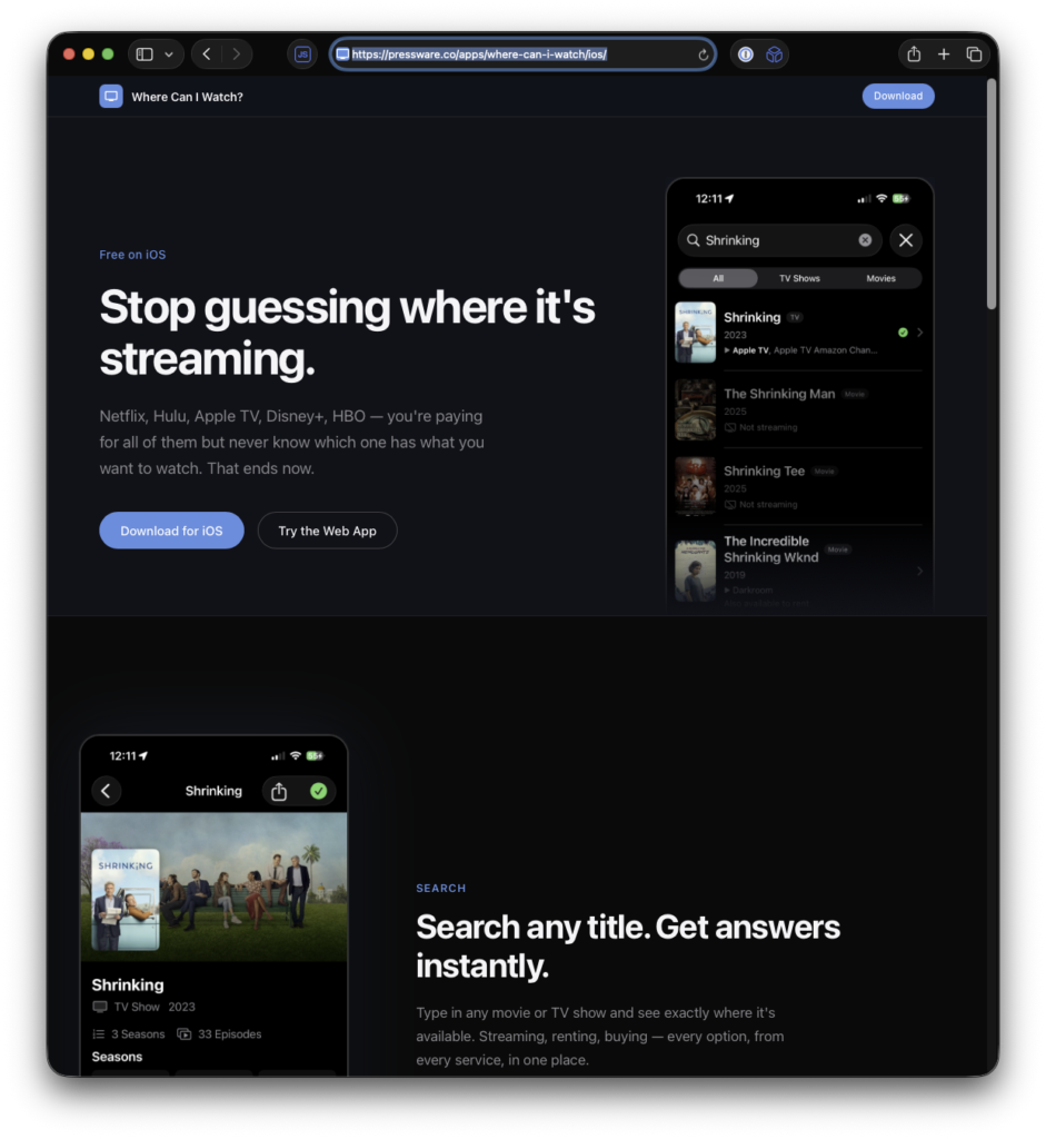 Where Can I Watch? is free on the App Store. No in-app purchases, no premium tier, no catch.